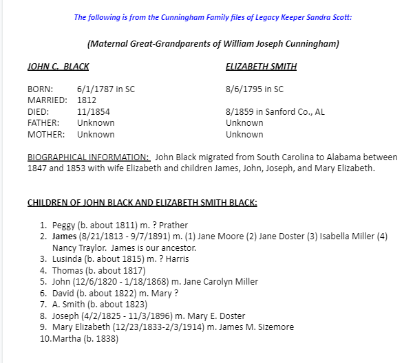 John C. Black and Elizabeth Smith Genealogical Information