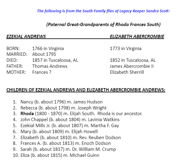 Ezekial Andrews and Elizabeth Abercrombie Genealogical Information