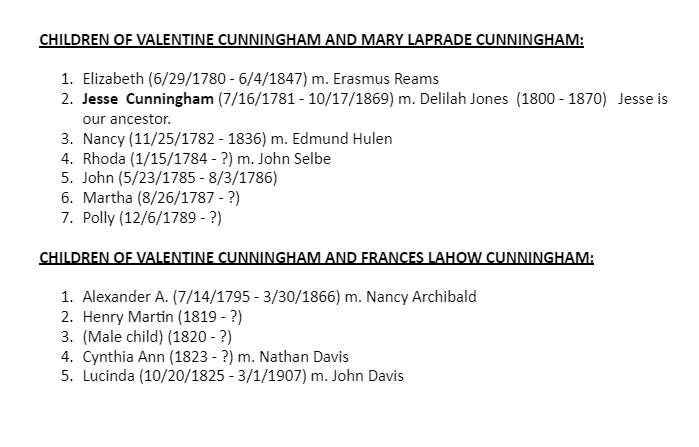 Valentine Cunningham and Mary LaPrade Genealogical Information