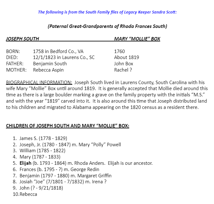 Joseph South and Mary "Mollie" Box Genealogical Information