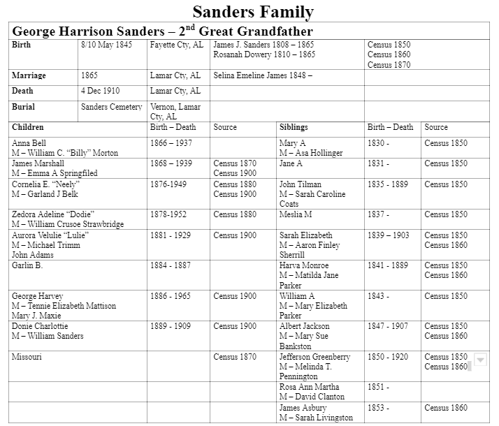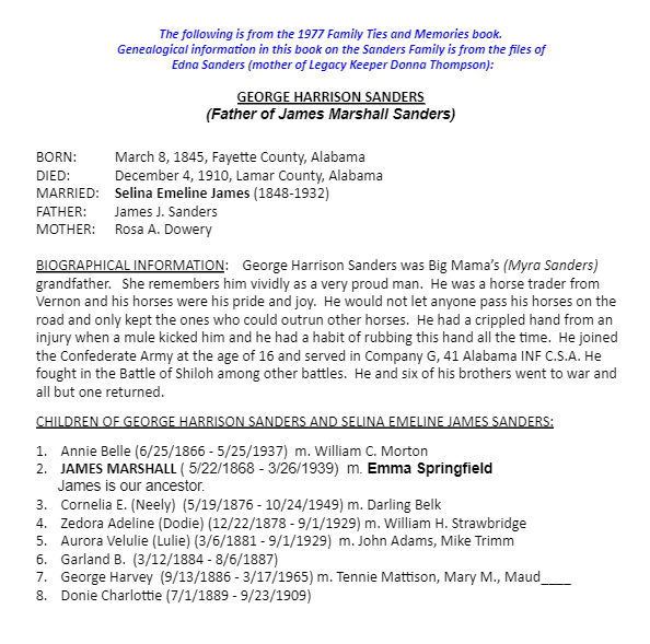 George Harrison Sanders and Selina Emeline James Genealogical Information