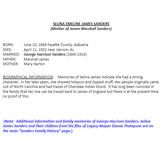 The following genealogical information is from the Sanders Family files of Legacy Keeper Janis McCoy: