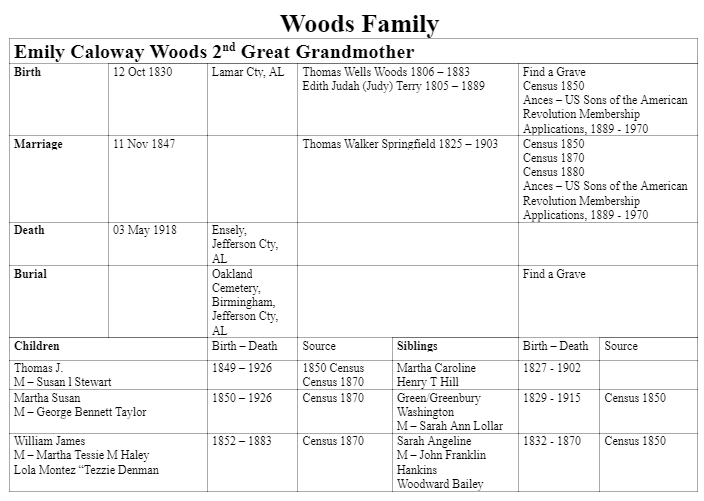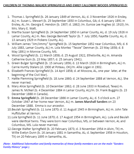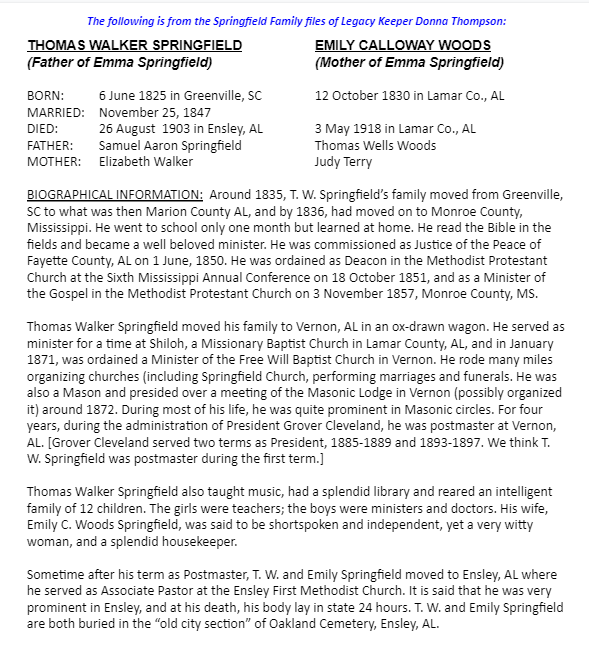 Thomas Walker Springfield and Emily Calloway Woods Genealogical Information