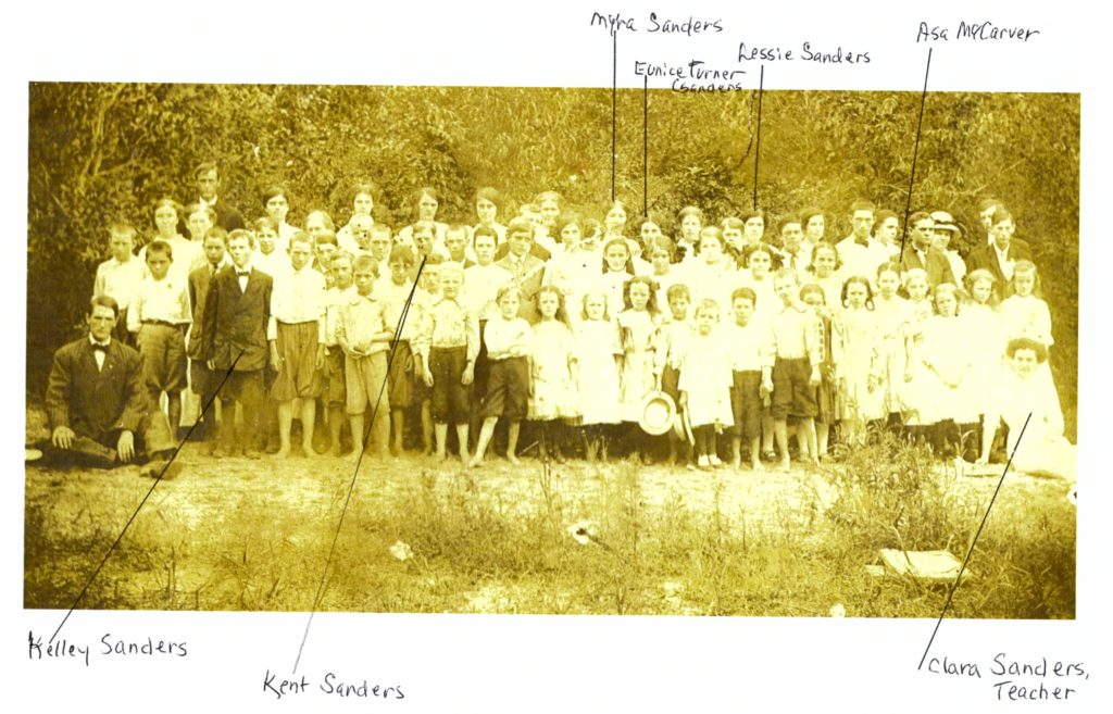 Second Row (l-r): Zela Chandler, Minnie Todd, Eldon Hankins, Malvie Hankins, Luther Hankins, Audie Finch, Kent Sanders, Will Boman, Perry Boman, Raymond Turner, Otis Chandler, Eunice Matthews, Ellie Morton, Adine Chandler (?), Fannie Bickerstaff, Siney Chandler.